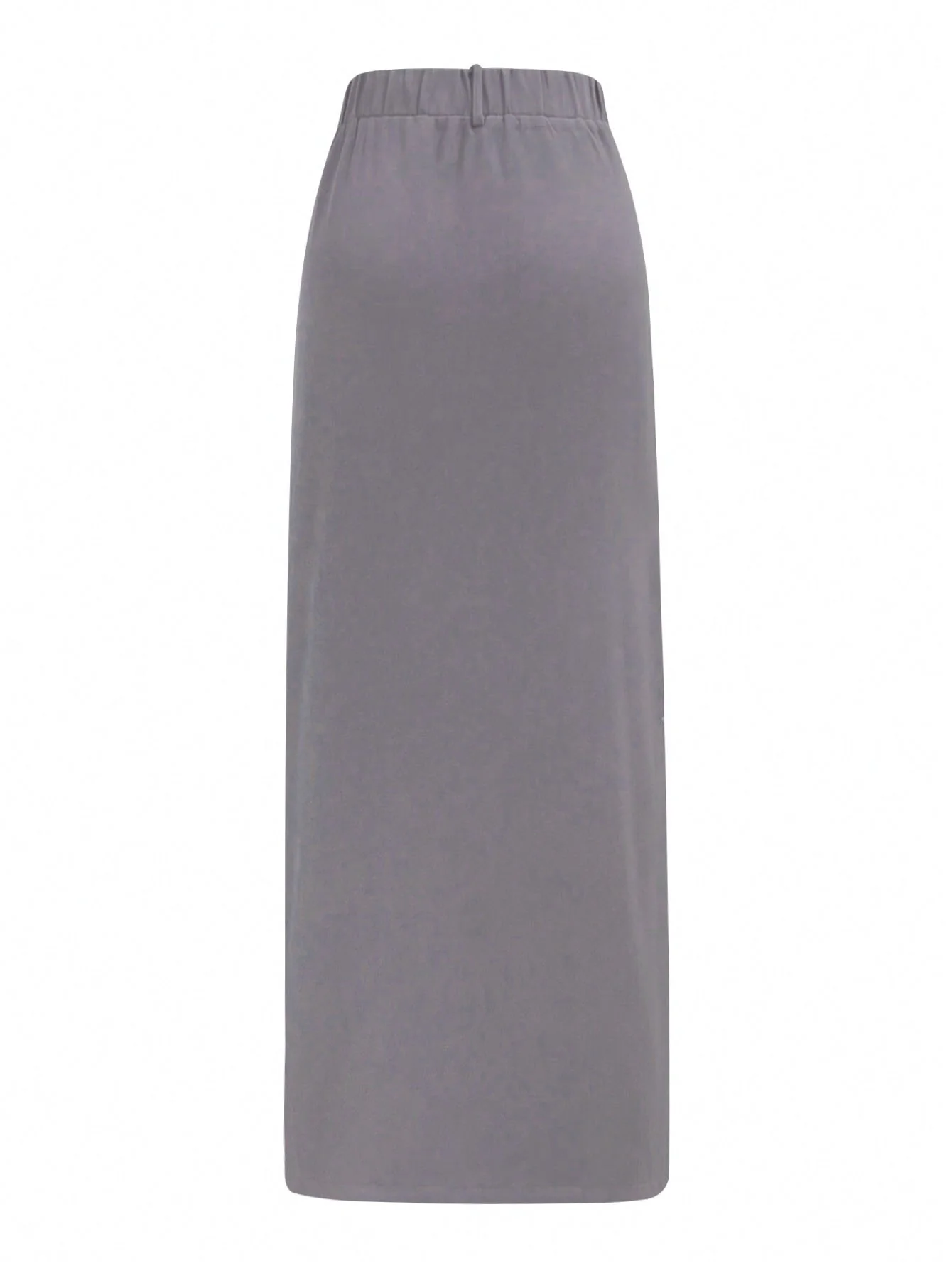 • Details: Clean waistband, side thigh slit for mobility, fluid drape